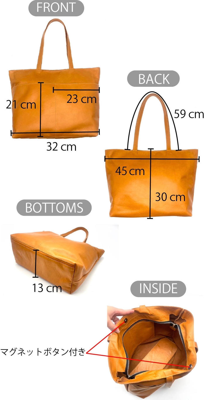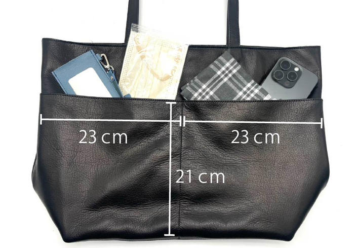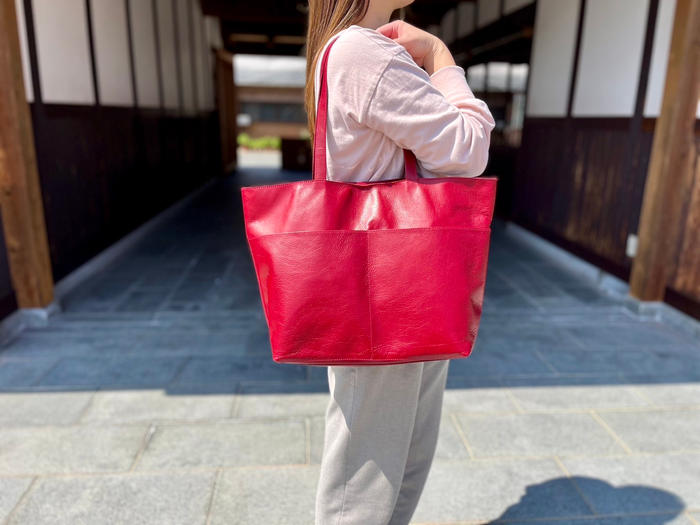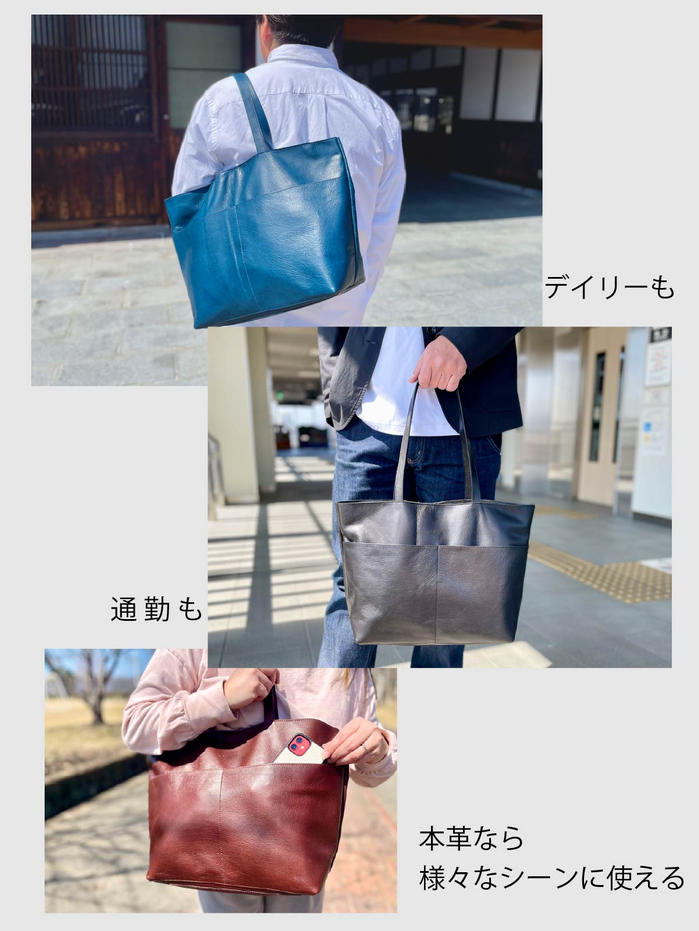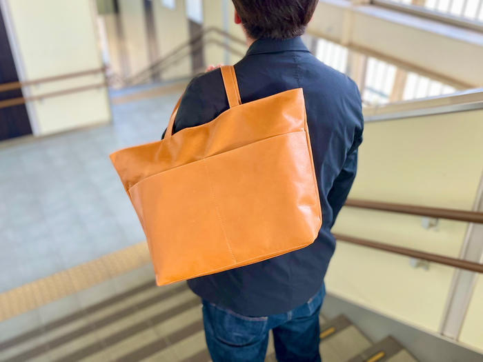 - 本革は重いイメージがあるかもしれませんが、『本革ポケトート』は薄く軽い革を採用。そのため、本革ながら約500g前後と嬉しい軽さです。そして裏地が必要ない加工により、軽量に仕上がっています。(革の厚みは均一ではないため、すべて同じ重さではありません。)
