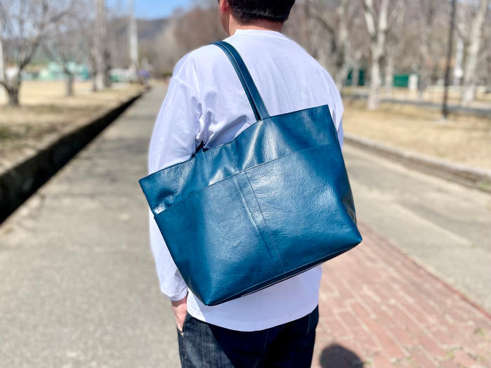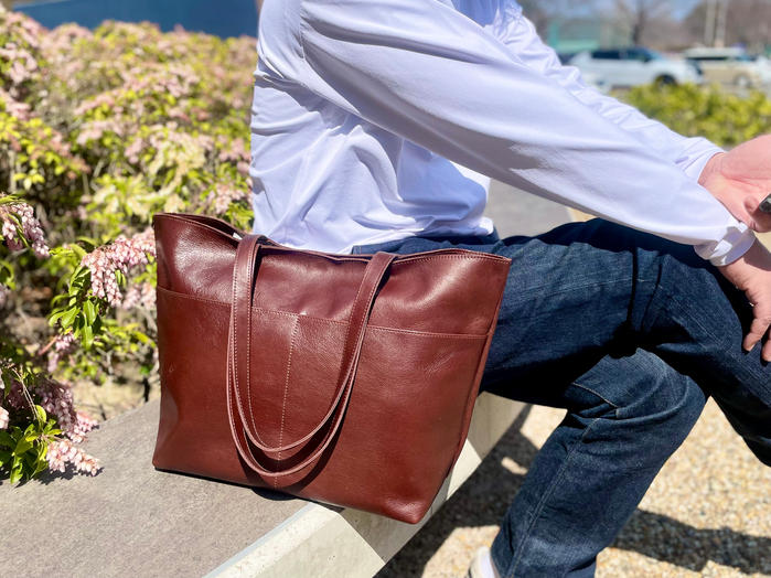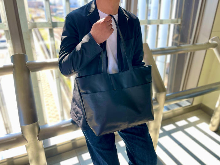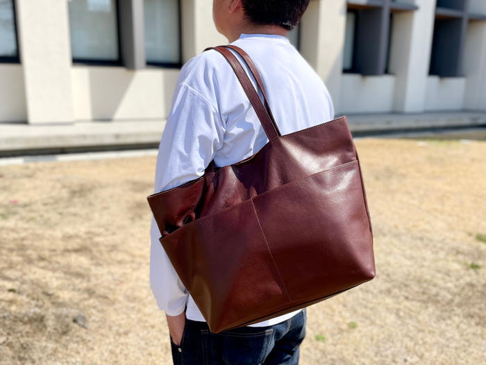 今回は、程よい使いやすさをテーマに革の質感を活かしたトートバッグを制作しました。くたっと感がかっこいい『本革ポケトート』が出来上がりました。 -