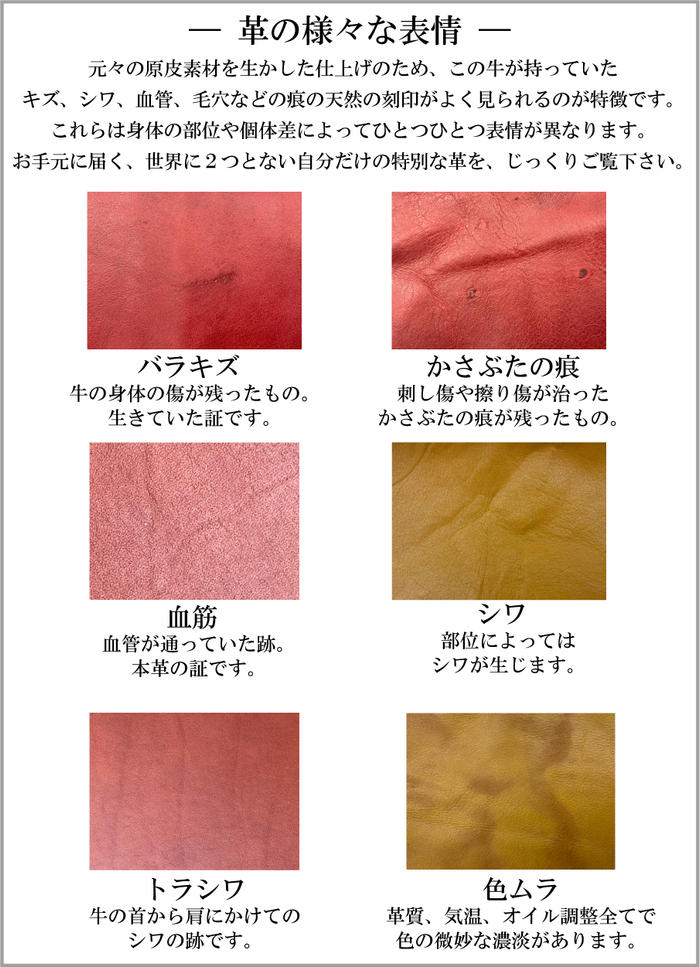 デッドストック革の解消を目的としているため、多少のキズやシワ・シミもあえて避けずに余すことなく使用している場合がございます。