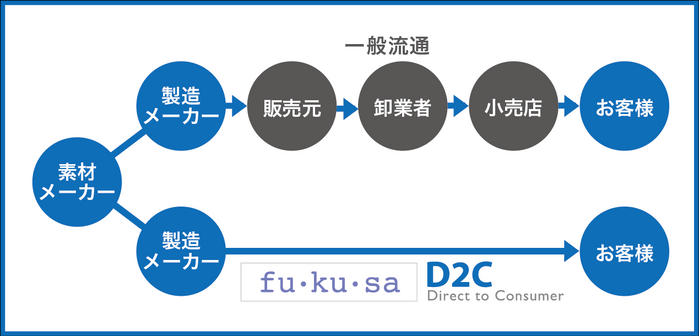 • こだわり抜いた高品質の素材と職人の技で仕上げた[fu・ku・sa]をより多くの方に手にとっていただくために、従来の商流ではなく、D2C(Direct to Consumer)という形をとって中間マージンを極力カットしました。