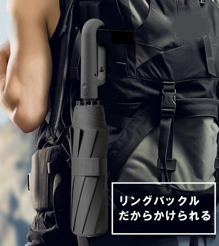 - A. 傘の持ち手部分に取り付けられたフックを使用して、リュックやトートバッグなどのストラップ部分に簡単に引っ掛けることができます。両手が自由になるため、移動時にも便利です。