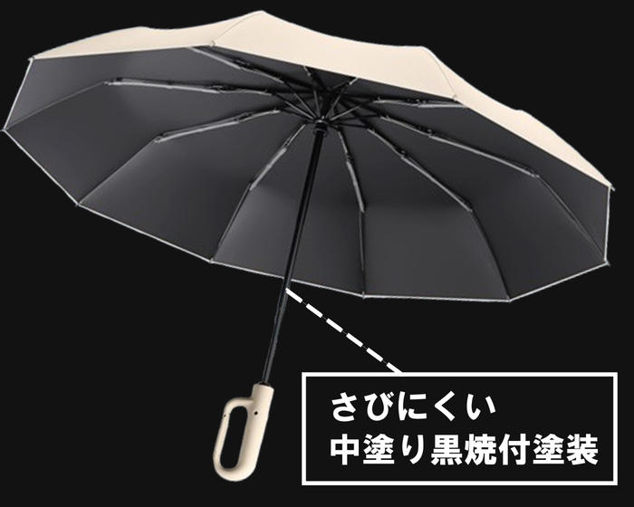 雨水にさらされる傘はさびやすい環境にあります。錆びないように、「中塗り黒焼き塗装」を採用しました