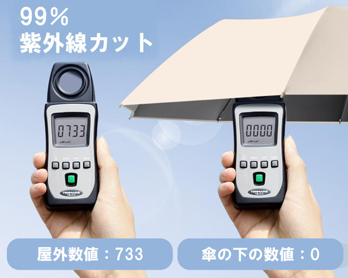 UPF50+の日傘に使用は、同じ太陽光の下で肌に紫外線による影響が出るまでに50倍以上の時間がかかることを意味します。