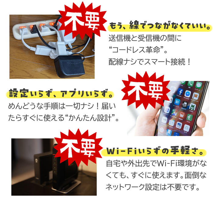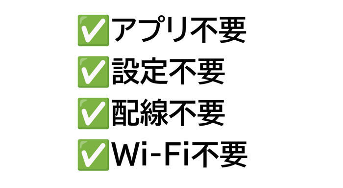 - 一般的なミラーリング機器は、HDMIケーブルや電源コードなど、複数の配線が必要になることが多く、接続だけでひと苦労。