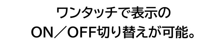 - 本製品は、操作性にも徹底的にこだわりました。たとえば、画面の表示をオン・オフに切り替える操作も、わずか1回のボタン操作だけ。複雑な設定メニューを開いたり、アプリを起動したりといった面倒な手順は一切不要です。