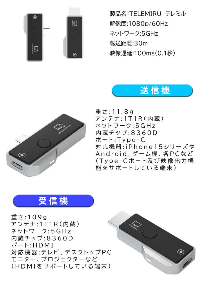 なお、本製品には内蔵バッテリーは搭載されておらず、ご使用時には常時電源の供給が必要です。送信機のType-Cポートおよび受信機のHDMIポートは、映像信号の送信と電力の双方向伝送の両方に対応しています。