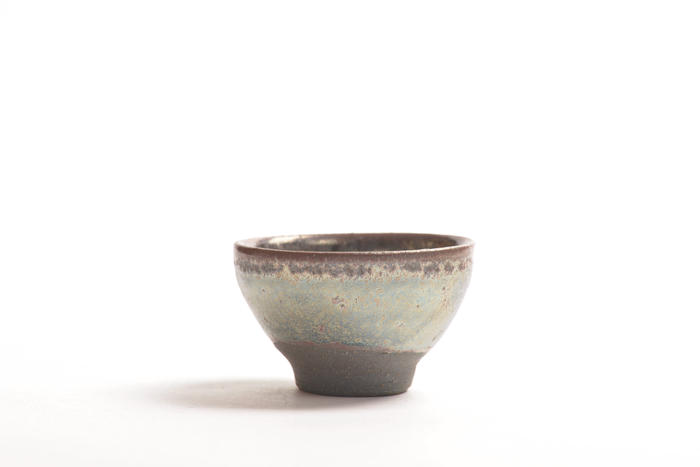 - 明るく爽やかな青と褐色とが混じり合う複雑な表情が目を引く杯。腰に丸みがある碗形(わんなり)をしています。胴の一部分は光沢が押さえられていますが、見込みには鮮やかな光沢が見られ、さらに禾目模様と油滴模様が浮かんで見えます。穏やかな釉流れも見どころ。指先でつまみやすく、杯中を鑑賞しながら日本酒を味わうのに最適なサイズです。自分へのご褒美や贈り物にどうぞ。