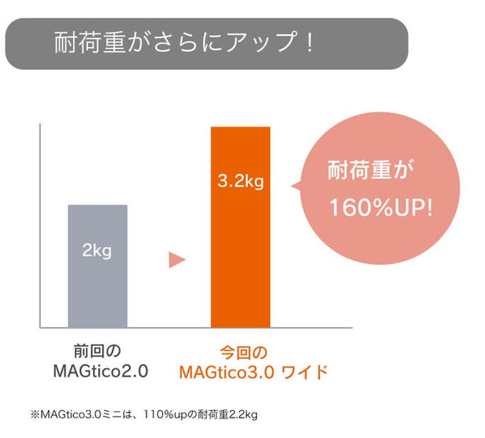 • MAGtico3.0(Wide)は、約3.2kgの重さまでOK(前回+1.2kg強力化)
