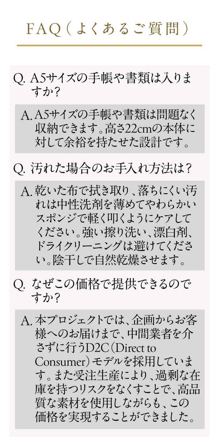 販売事業者名株式会社フランフォレ販売事業者所在地〒810-0001 福岡県 福岡市中央区 天神2丁目 3番10号 天神パインクレスト716代表者または運営統括責任者石原 幸太朗代表者または運営統括責任者(フリガナ)イシハラ コウタロウ連絡先/ホームページhttps://www.minimalleather.jp/連絡先/電子メールinfo@minimalleather.jp連絡先/TEL092-577-0155販売価格帯※各プロジェクトページの「リワード代金」をご覧ください。価格は税込です。商品等の引き渡し時期(日数)・発送方法商品の引渡し時期またはサービスの提供時期は、各プロジェクトページの記載をご確認ください。代金の支払時期および方法《決済手段》クレジットカードコンビニ決済《支払時期》本プロジェクトは実行確約型です。商品購入時に決済が行われます。商品代金以外に必要な費用 /送料、消費税等送料無料 (商品代金に含む)返品の取扱条件/返品期限、返品時の送料負担または解約や退会条件《返品の取扱い条件》輸送による商品の破損および発送ミスがあった場合のみ返品可。商品到着後14日以内に起案者までご連絡いただいた後、起案者から連絡のある返送先へご返送下さい。上記返品条件に該当しないお客様都合のキャンセルはお受けしておりません。不良品の取扱条件商品受取時に必ず商品の確認をお願いいたします。商品には万全を期しておりますが、万が一下記のような場合にはお問い合わせフォームにてお問い合わせ下さい。・申し込まれた商品と異なる商品が届いた場合・商品が汚れている、または破損している場合上記理由による不良品は、商品到着後14日以内に起案者までご連絡いただいた後、起案者から対応方法をお客様宛にご連絡致します。