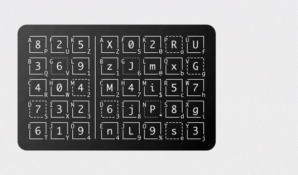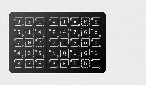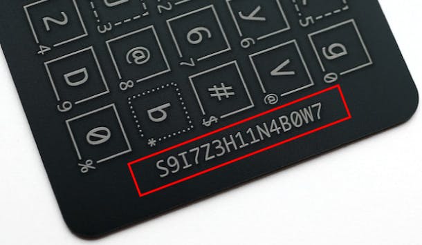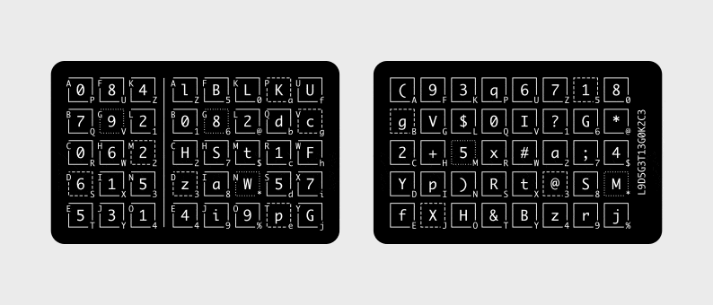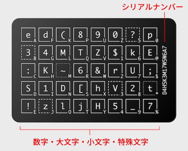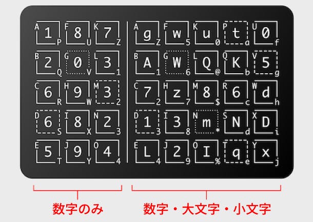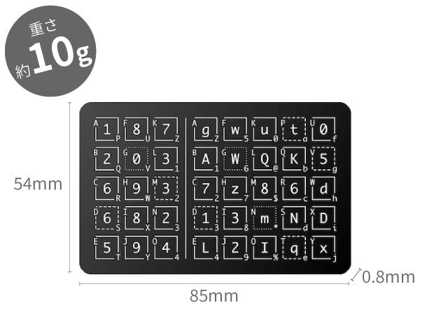 表と裏で異なる組み合わせの英数字が印字されており、どちらでもパスワードの生成が可能です。