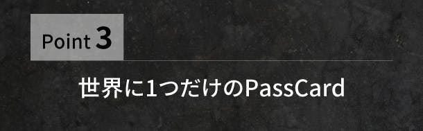 また、すべてのPassCardには各カードを識別する固有のシリアルナンバーが刻印されており、印字されている文字が全て異なる為、同じカードは存在しません。