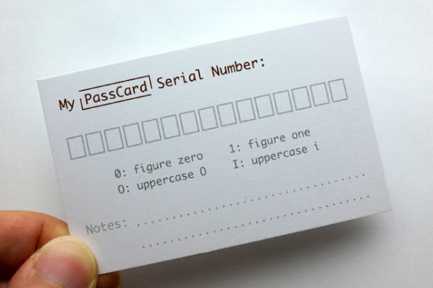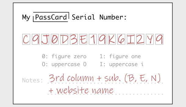 PassCardを受け取ったら、このカードに15文字のシリアル番号を書き留めて、安全な場所に保管してください。
