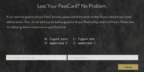 PassCardを紛失した場合は、webサイトにアクセスし、記録カードに書き留めた15文字のシリアル番号とメールアドレスを入力し送信してください。