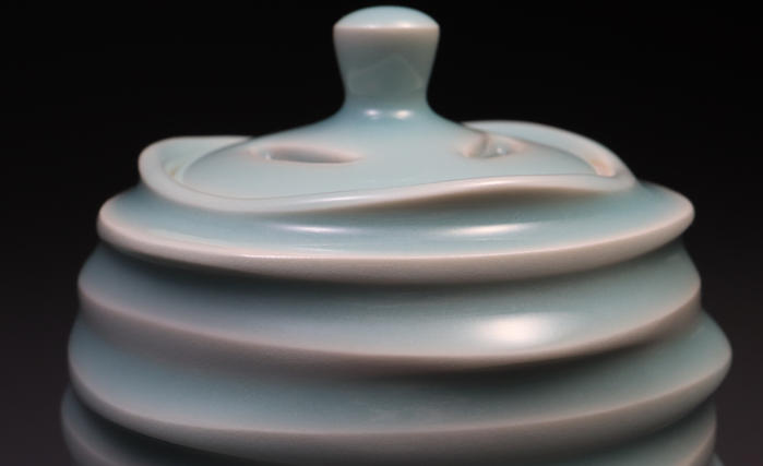 - ろくろ成形した後、カンナで面を削り込んで形に変化をつけ、青白磁の釉薬を掛けることで、稜線が際立つ効果をねらっています。