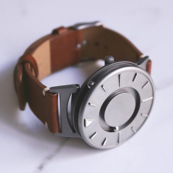 使うほど自分のものになっていく楽しみがあるイタリアンレザーバンドにチタン製のボディが特徴的。わずか46gの重さの、長時間つけていても手首に疲れがたまりにくい軽さが自慢のモデルです。 時間を知る新しい方法「さわる時計 Bradley」