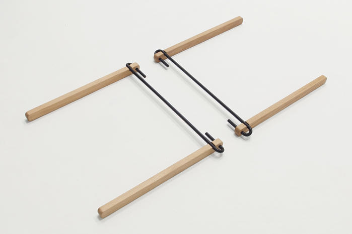 - 両端をU型に曲げた金物に木部材を挿しこむ独自の脚構造と、ロール式天板によって、工具を使わず簡単に組立・分解することができます。金物は脚を繋ぐだけではなく、カップや道具を吊るハンガーとしても機能し、収納運搬時はハンドルにもなります。